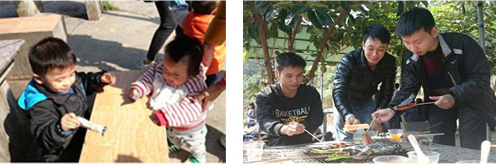 相對(duì)那些很久沒騎過自行車的同事來說,10公里還是有點(diǎn)困難的,況且一路上很多的坡斜、彎道,不過眼前有如此美景的吸引,大家都選擇完成全程。此時(shí)已是十一點(diǎn)多鐘了,體力也消耗的差不多,肚子也咕咕地叫起來,正好備有第二個(gè)活動(dòng):燒烤。一到燒烤場(chǎng)便是香氣撲鼻,看著別人哼著小曲,燒著雞翅,喝著小酒,劃著小拳,我們的心情早已按奈不住了,來到提前預(yù)定好的烤場(chǎng)前,看到很多好吃的東西:有肉丸、牛排、肉排、雞翅、雞腿、茄子、香橙、飲料等等。大家都紛紛拿著水果,飲料先充充饑,接著各自拿著一根細(xì)細(xì)的鐵絲,串上肉類蔬菜,放在烤爐上,抖撒各種調(diào)料,漸漸的香味四溢,烤得好的,大家搶著要吃,淋漓滿目燒肉串,那場(chǎng)景是相當(dāng)?shù)膲延^,不禁讓我們想起周星馳電影《唐伯虎點(diǎn)秋香》中的一句經(jīng)典臺(tái)詞:“紅燒翅膀,我喜歡吃!”。現(xiàn)場(chǎng)到處都是香味四溢,歡聲笑語(yǔ)。